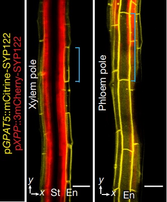 In vascular plants, the root endodermis surrounds the central vasculature as a protective sheath that is analogous to the polarized epithelium in animals, and contains ring-shaped Casparian strips that restrict diffusion. After an initial lag phase, individual endodermal cells suberize in an apparently random fashion to produce ‘patchy’ suberization that eventually generates a zone of continuous suberin deposition. Casparian strips and suberin lamellae affect paracellular and transcellular transport, respectively. Most angiosperms maintain some isolated cells in an unsuberized state as so-called ‘passage cells’, which have previously been suggested to enable uptake across an otherwise-impermeable endodermal barrier. Here, they demonstrated that these passage cells are late emanations of a meristematic patterning process that reads out the underlying non-radial symmetry of the vasculature. This process is mediated by the non-cell-autonomous repression of cytokinin signalling in the root meristem, and leads to distinct phloem- and xylem-pole-associated endodermal cells. The latter cells can resist abscisic acid-dependent suberization to produce passage cells. Their data further demonstrate that, during meristematic patterning, xylem-pole-associated endodermal cells can dynamically alter passage-cell numbers in response to nutrient status, and that passage cells express transporters and locally affect the expression of transporters in adjacent cortical cells.